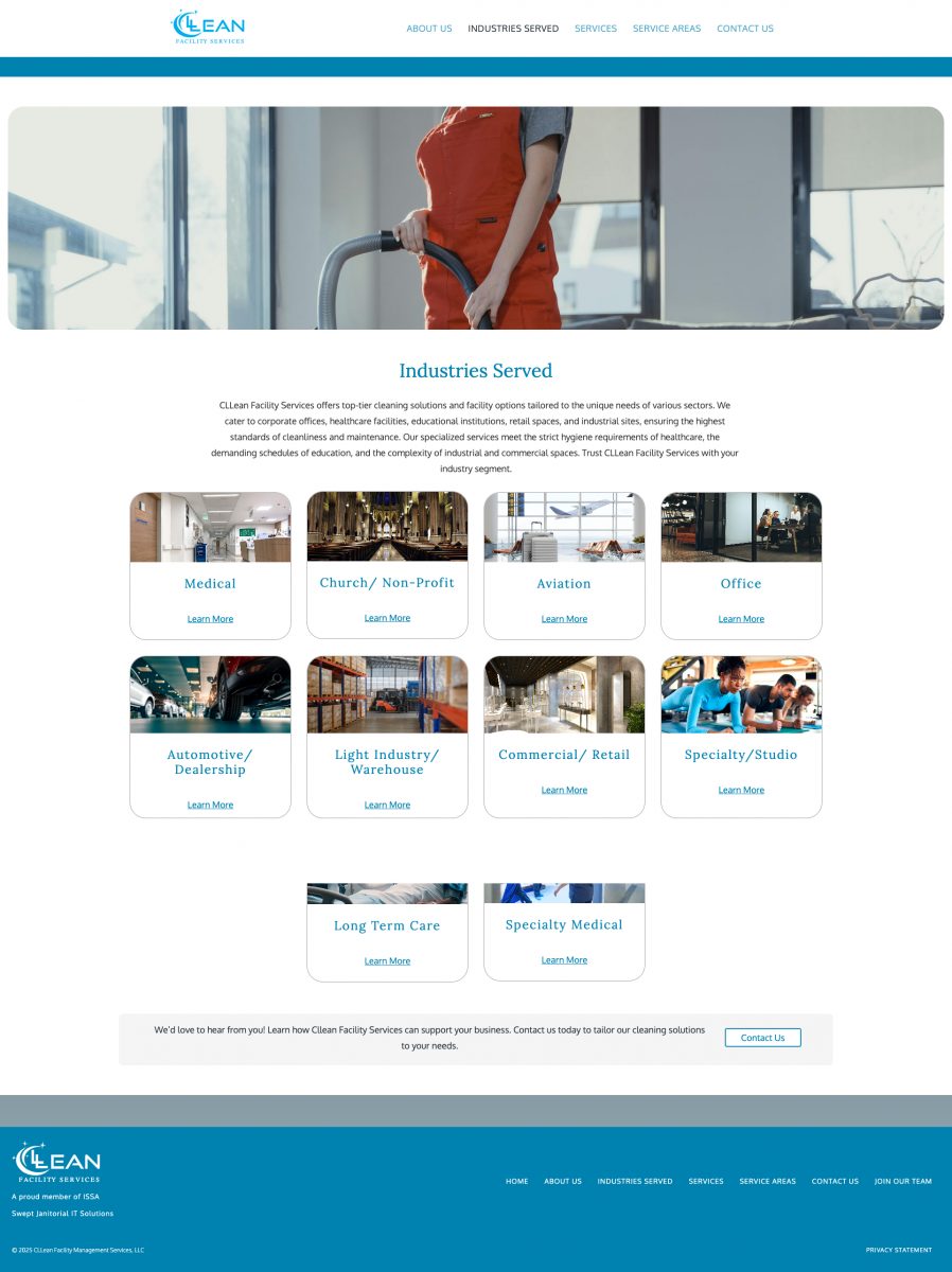 Designed and developed a brochure website for a commercial cleaning start-up, navigating multiple rounds of iteration to align with input from dual stakeholders. Integrated a custom CMS to support client-driven content updates and long-term scalability.